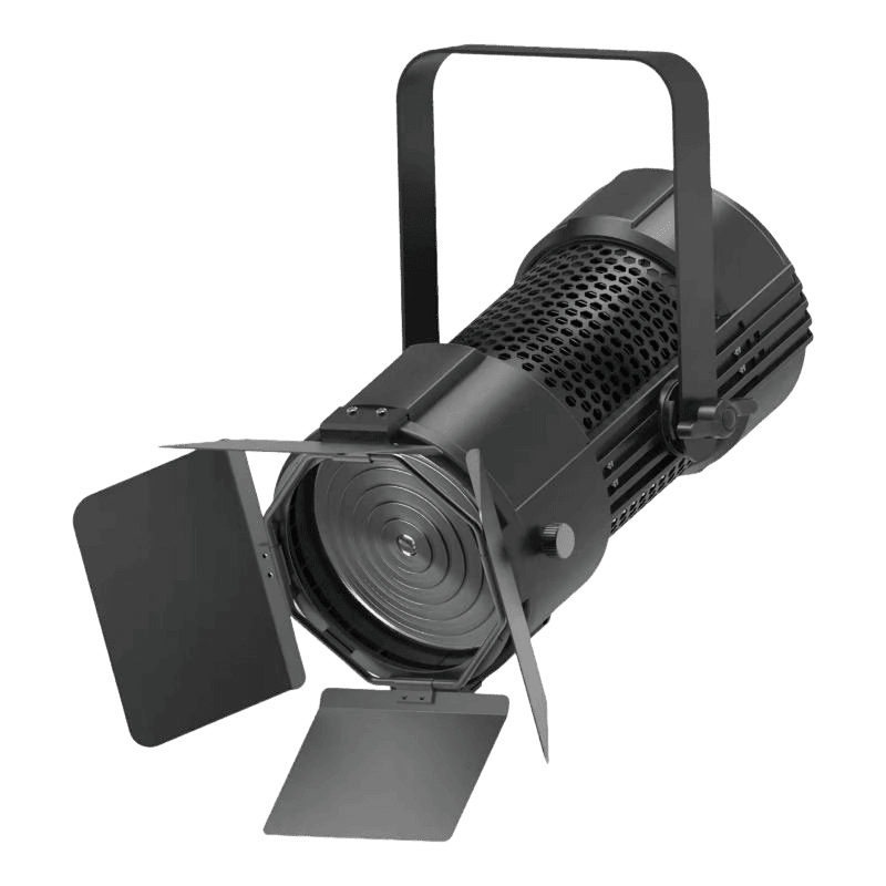The spotlight offers 0–100% 16-bit linear flicker-free dimming and supports DMX512/RDM remote control. Coupled with four-leaf barndoors, it enables precise shaping of character outlines and scene layering.