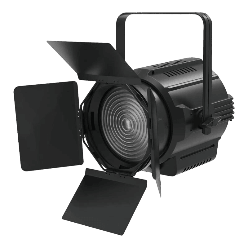 The LED Studio Fresnel Spotlight is a professional lighting device specifically designed for film and television studio stages, web series sets, and high-definition live streaming rooms. It features a high-power COB LED combined with a premium Fresnel lens optical system, delivering ultra-high color rendering (Ra ≥ 95, R9 ≥ 90, TLCI ≥ 96), uniform and soft light output with smooth edge transitions. Free from UV/IR harmful radiation, it protects actors’ skin and props. The spotlight offers 0–100% 16-bit linear flicker-free dimming and supports DMX512/RDM remote control. Coupled with four-leaf barn doors, it enables precise shaping of character outlines and scene layering.